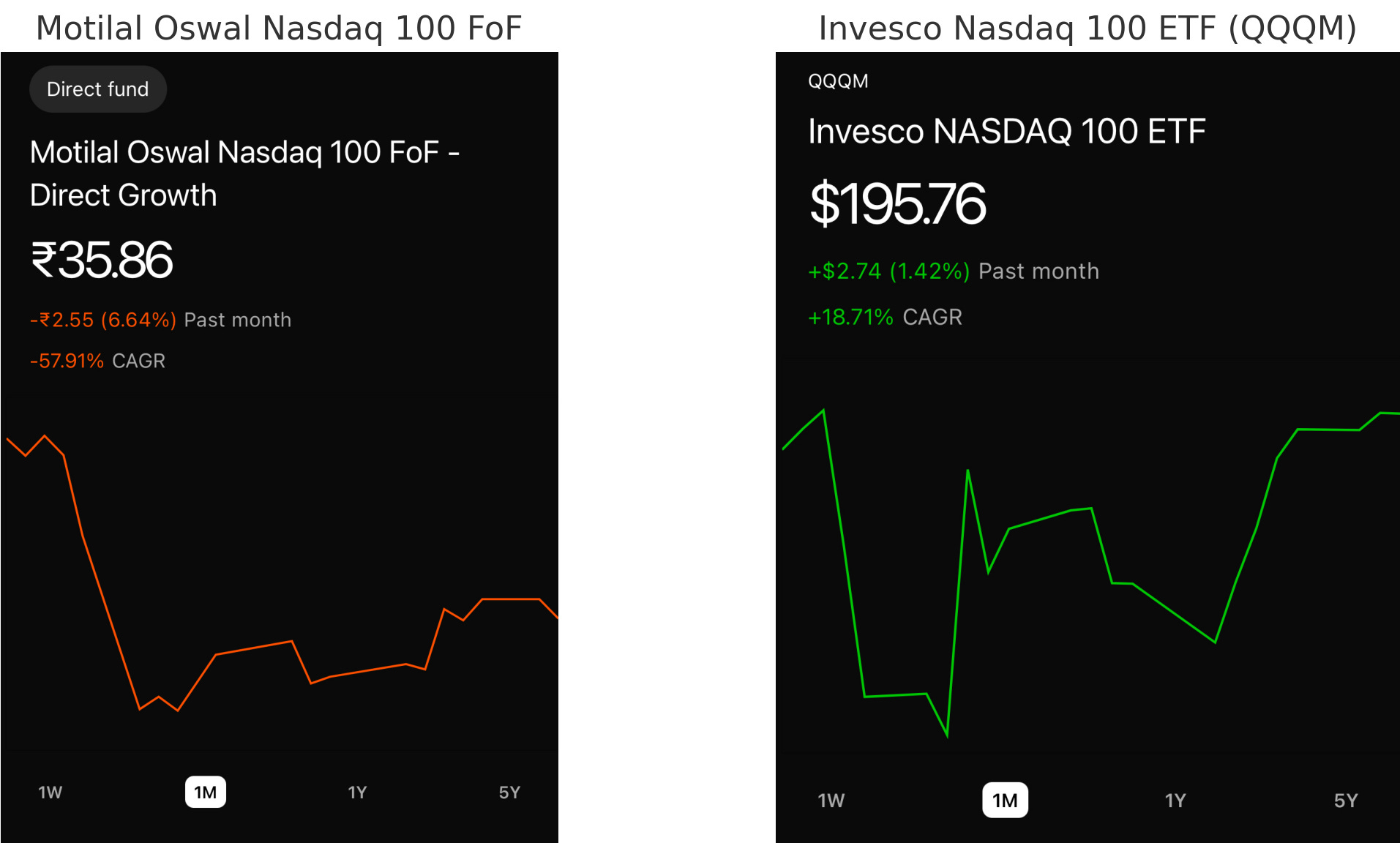 Out of curiosity, I opened the app to compare Motilal Oswal’s NASDAQ 100 Mutual Fund with QQQM, the US-domiciled equivalent.